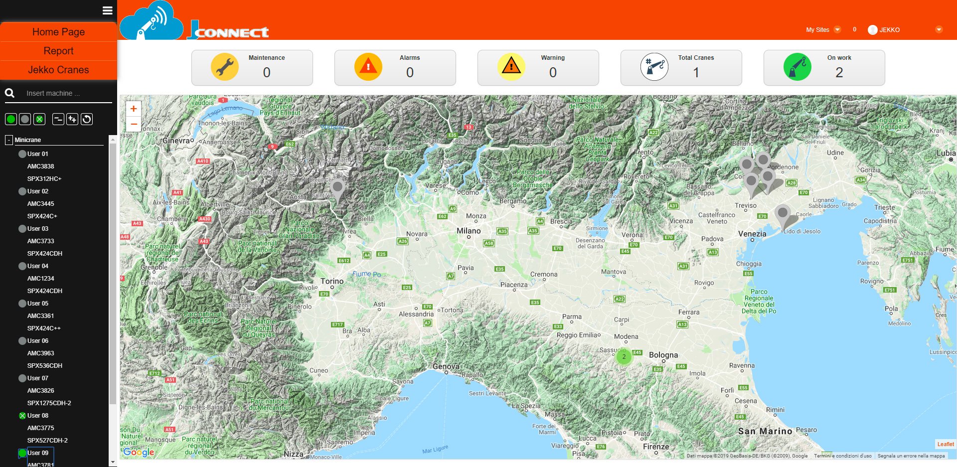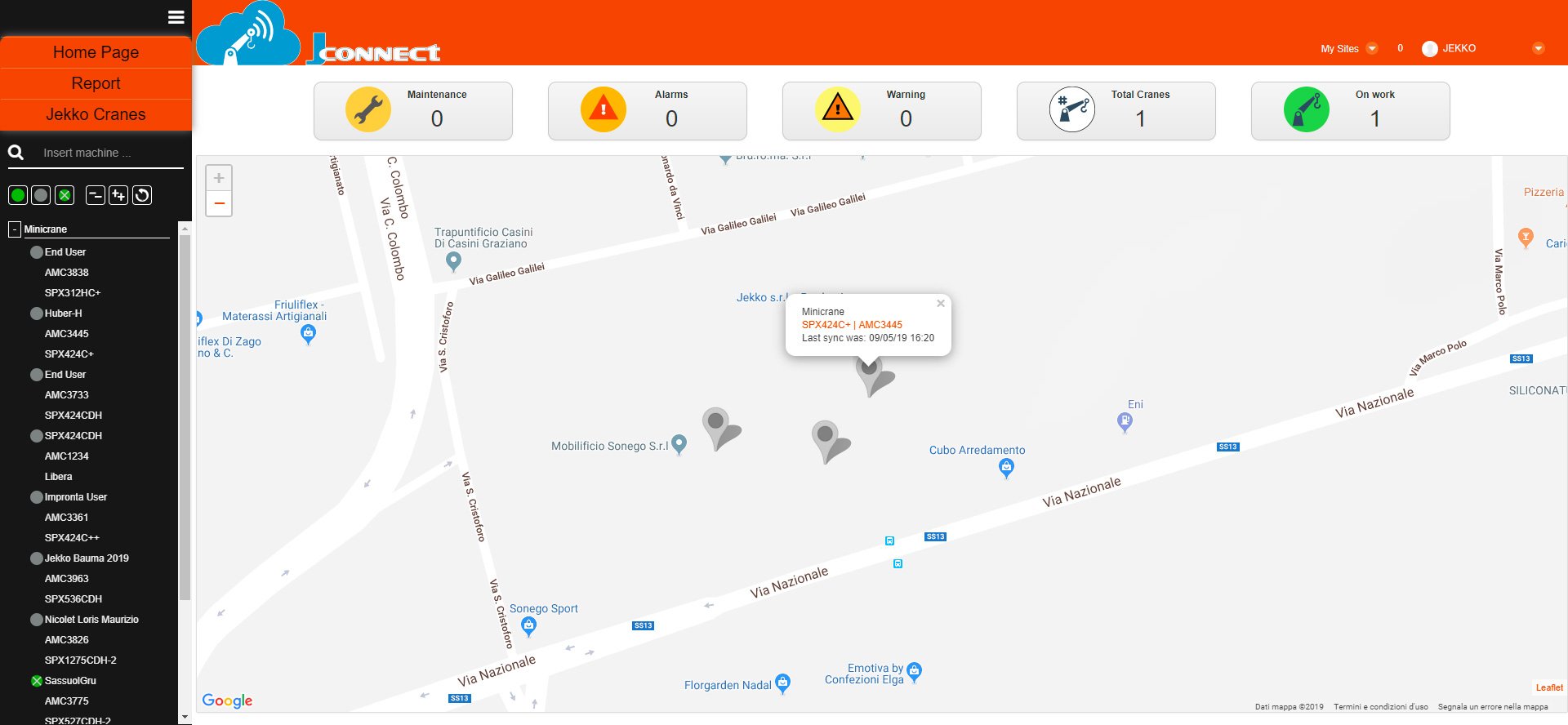 Kuvia klikkaamalla voit nähdä kuinka sovellus mahdollistaa tarkan sijainnin jokaiselle mininosturille, sekä koneiden tilan. Kone voi olla käynnissä, pysäytetty, korjaustilassa tai varoitus/hälytys tilassa.