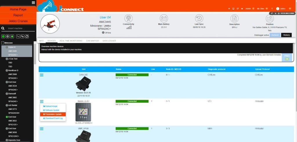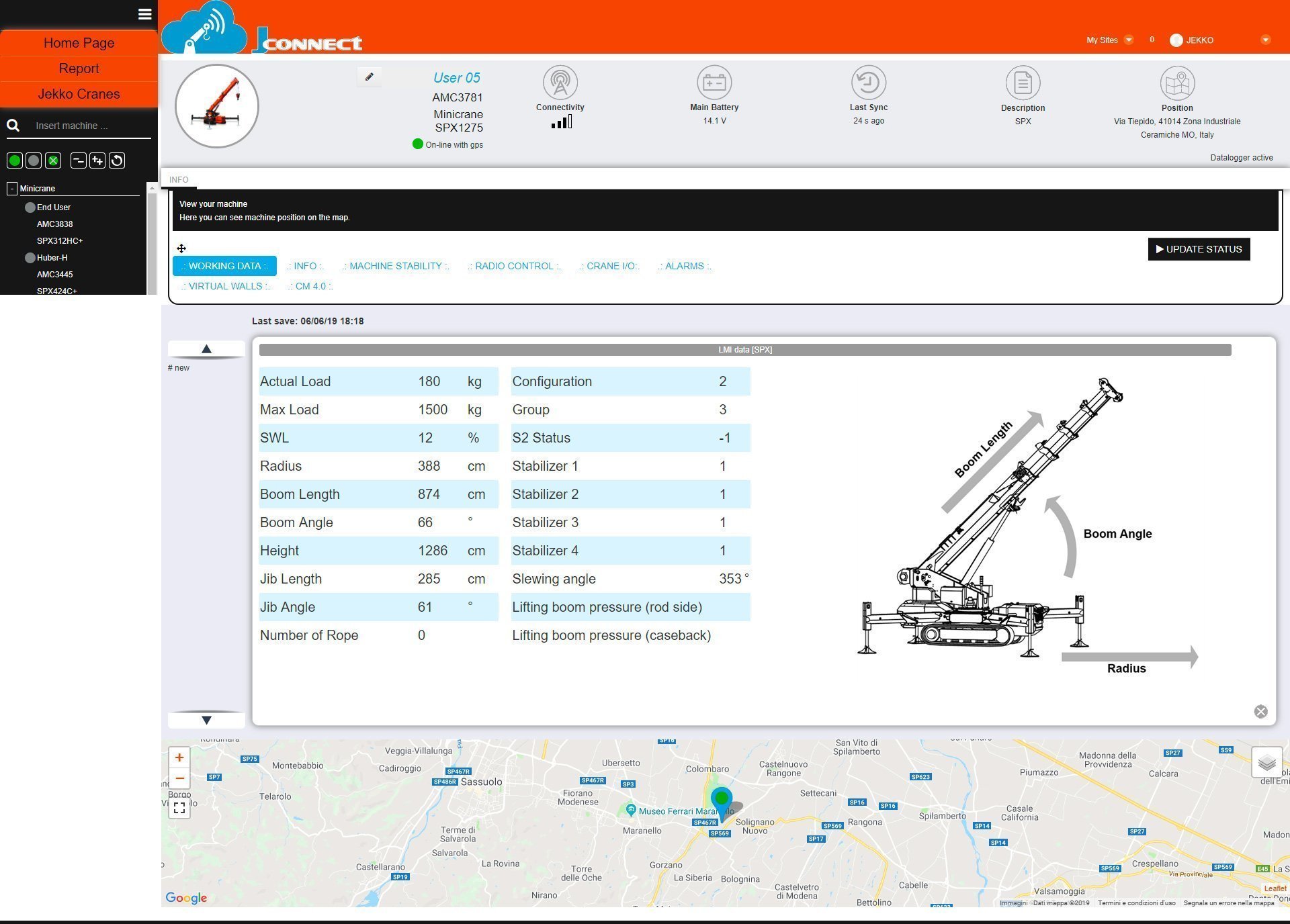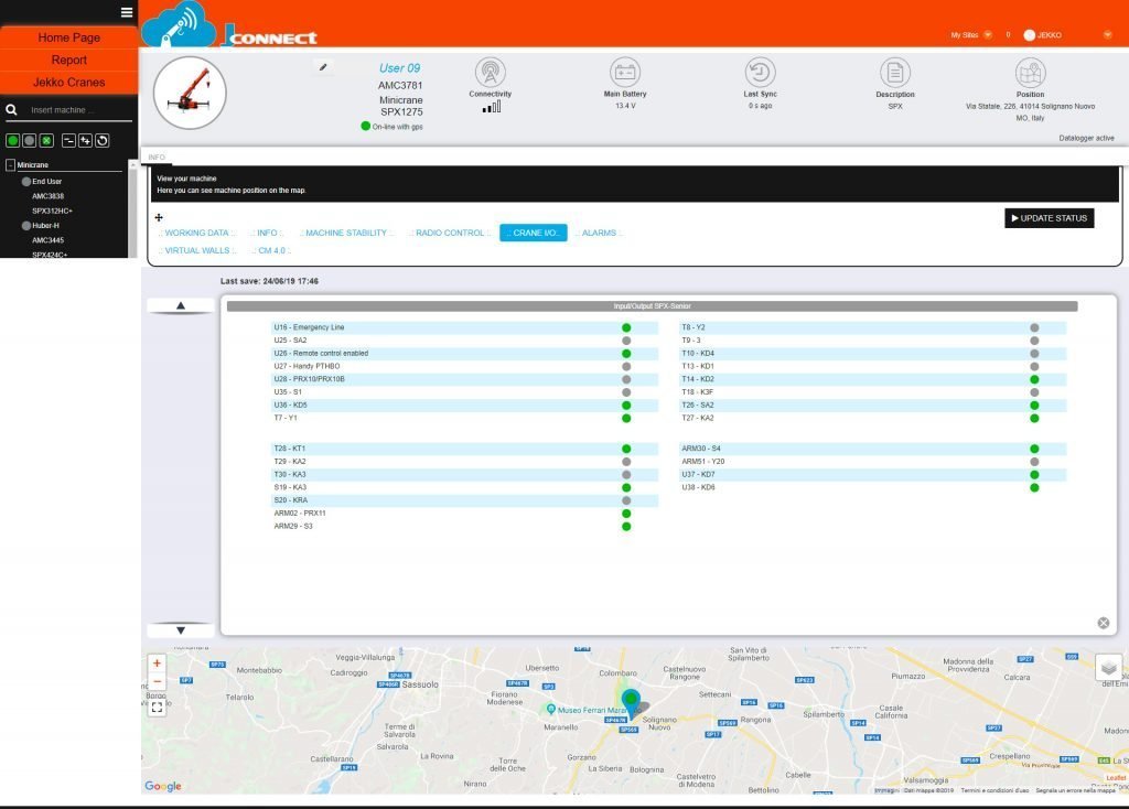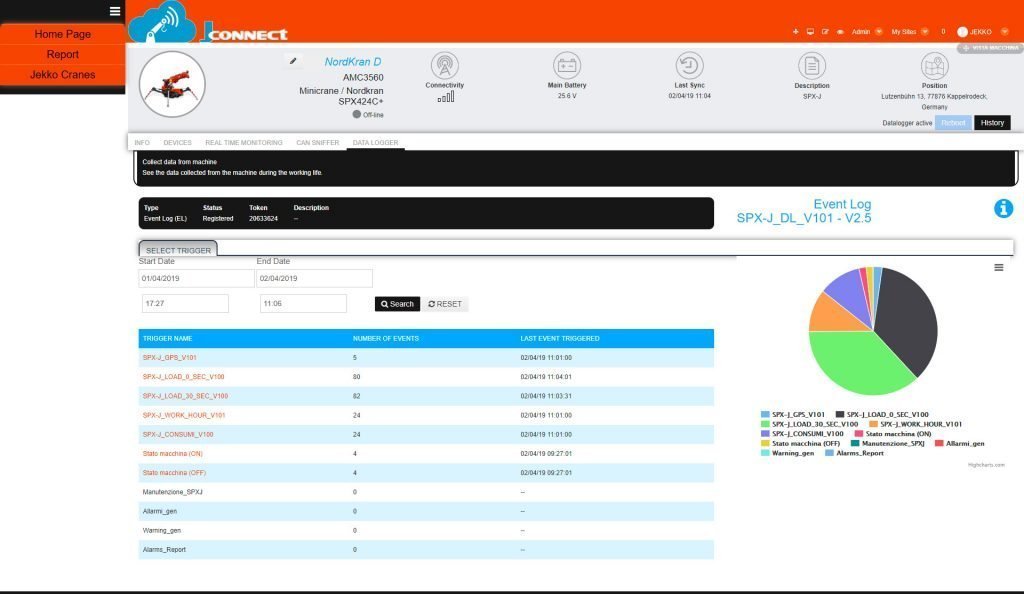 Kaikki reaaliaikainen tieto on nähtävissäsi. Jokainen toimenpide ja napin painallus näkyy J-connectilla, kuten puomin asento ja tukijalkojen asento. Ylläolevia kuvia klikkaamalla näet enemmän.