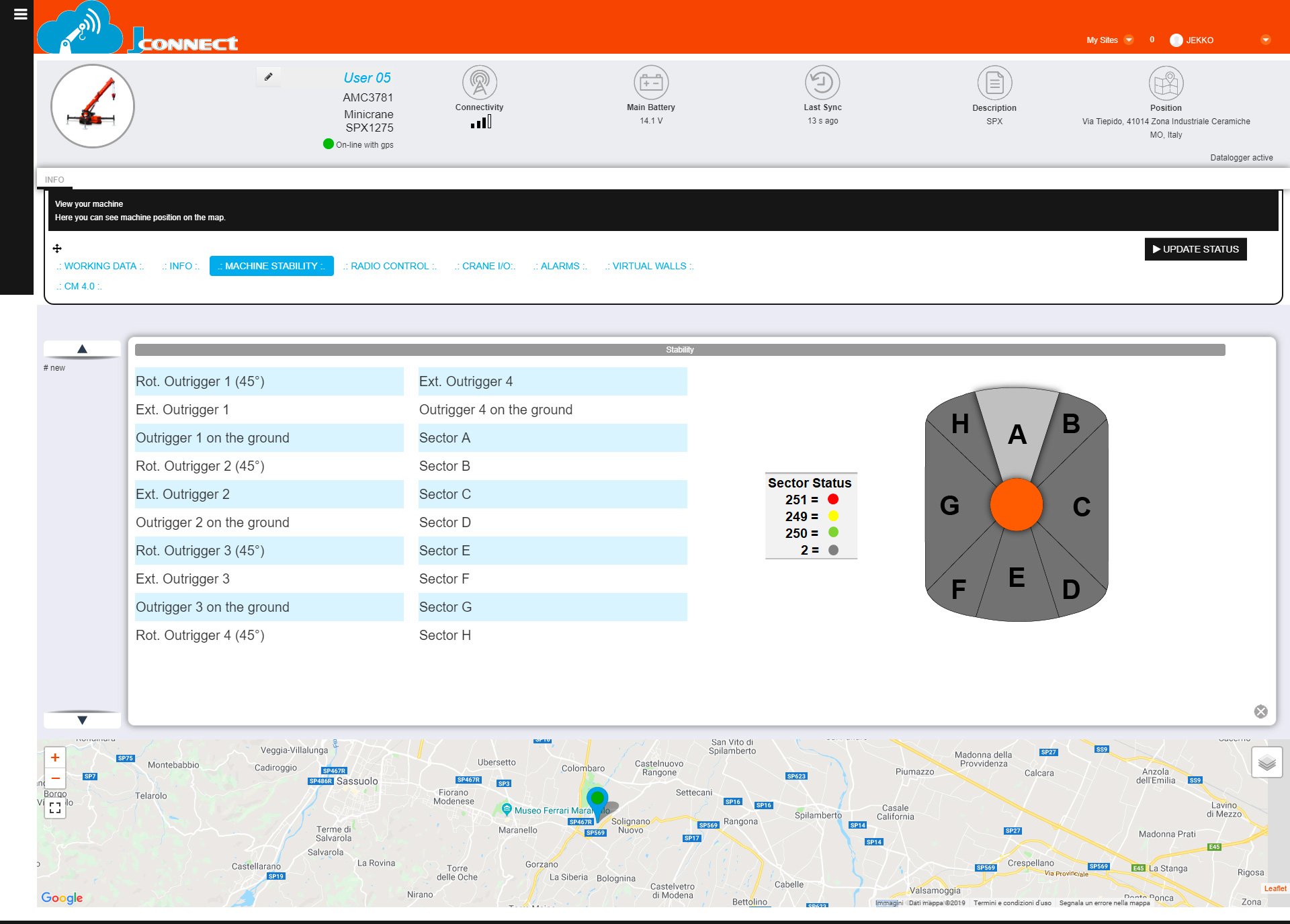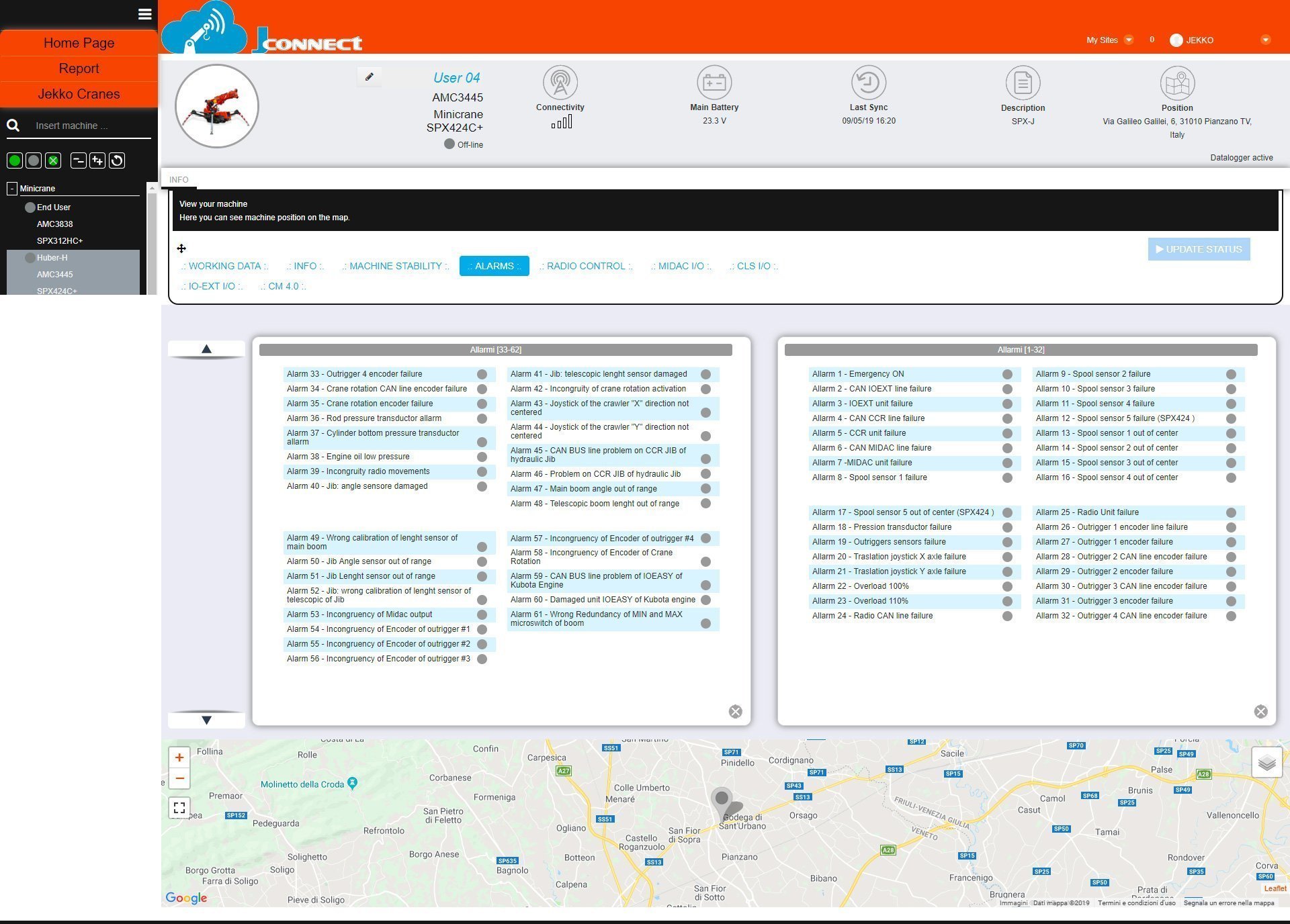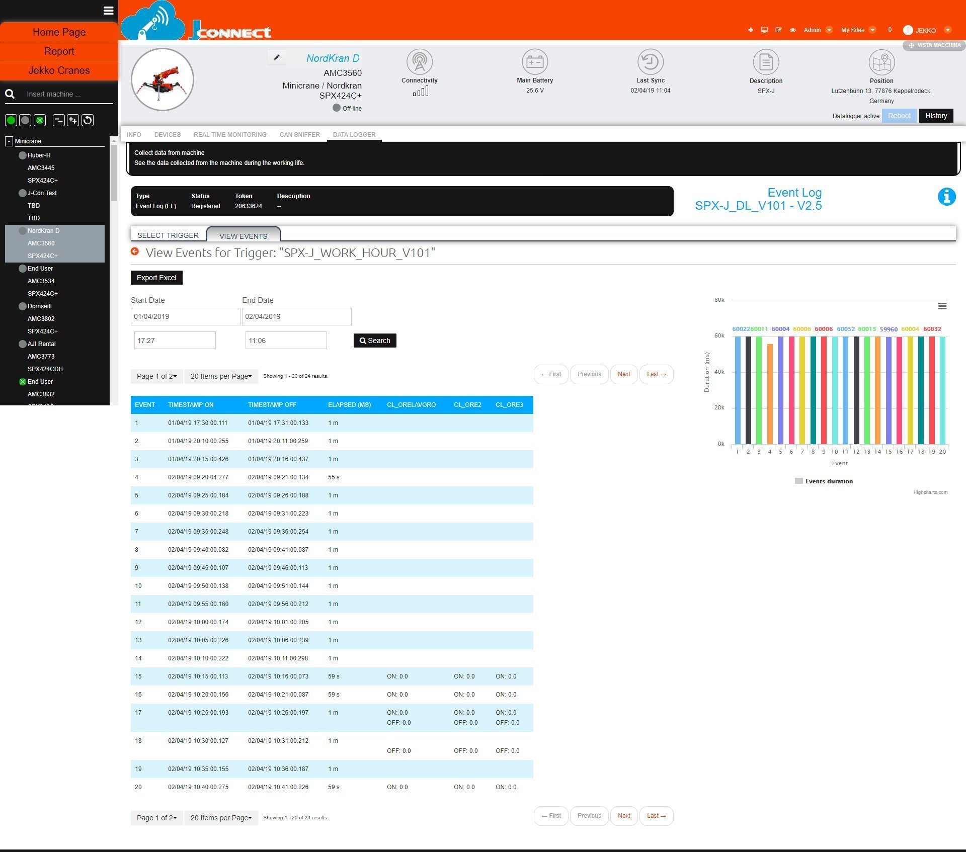 Kaikki reaaliaikainen tieto on nähtävissäsi. Jokainen toimenpide ja napin painallus näkyy J-connectilla, kuten puomin asento ja tukijalkojen asento. Ylläolevia kuvia klikkaamalla näet enemmän.